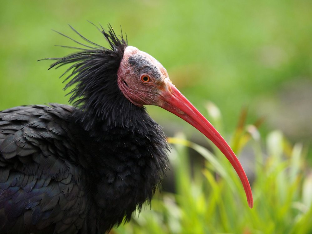 The Northern Bald Ibis has a very distinctive appearance, with a bare red face, neck with throat and long, narrow feathers projecting from the back of the head and neck. According to animal experts, the Northern bald ibis is the rarest bird in the Middle East.