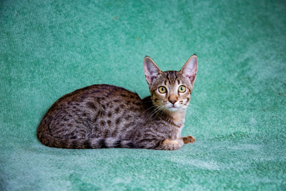 The Savannah looks exactly like an African Serval Cat because they are actually a cross between a domestic cat and a medium sized African serval cat. Of course, they are domestic cats that can be kept in your house. However, Savannahs are very energetic and playful, so they need daily exercise and games to consume their energy.