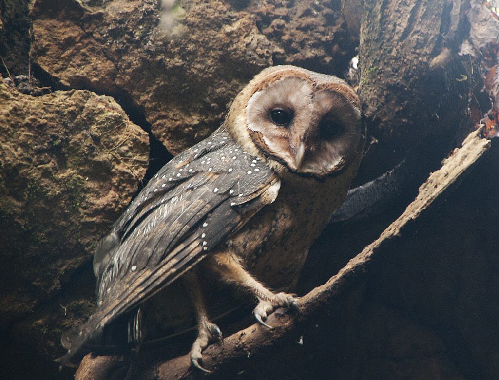The Galapagos Barn Owl has a heart-shaped facial disc and large, dark eyes. The facial disc is used to collect sounds from below and bring them to the ears, like a satellite dish.