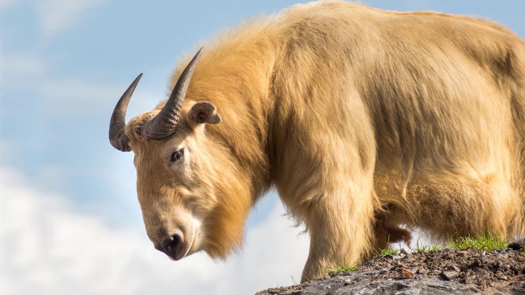 With horns like a wildebeest, a nose like a moose, a tail like a bear, and a body like a bison, the takin (rhymes with rockin’) looks like a character from Dr. Seuss!