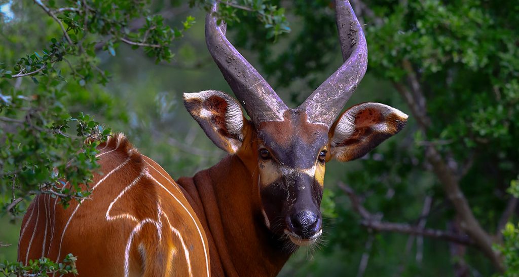 The Bongo is a large and heavy-bodied antelope with a short and glossy, orange or chestnut coloured coat that is darker on the underside and patterned with between 10 and 15 vertical white stripes that help the Bongo to remain camouflaged in the dense jungle. They also have distinctive white markings on their cheeks, a white chevron between the eyes and nose and a white crescent-like shape on their chest. find out more!