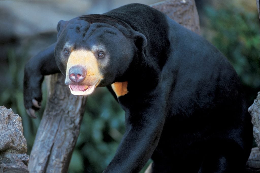 The omnivorous sun bear relies primarily on fruit and insects to meet its needs. Its front paws and long claws rip open trees in search of insects or sap. Other occasional food choices include small birds, fruit, honey, lizards, rodents, and soft parts of palm trees. Strong jaws and teeth even help this bear open coconuts!