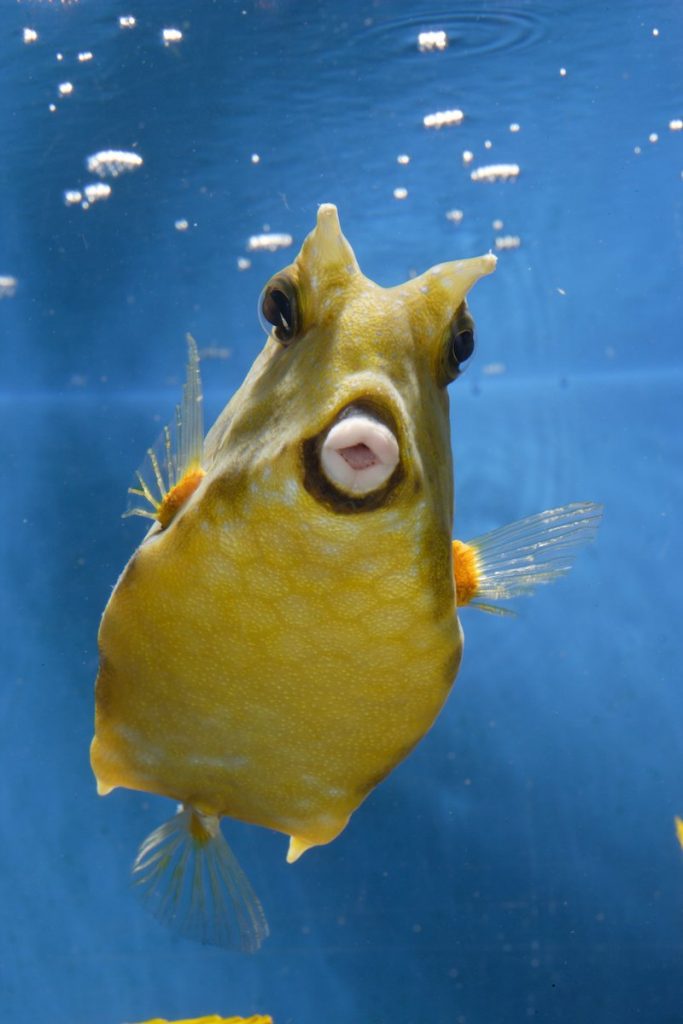Longhorn Cowfish are yellow to tan coloured with white spots. Adults are often solitary and territorial and live around sand or rubble bottom up to a depth of 50 metres.
