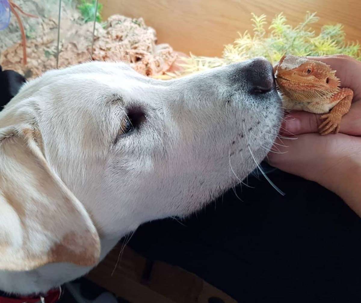Though many people assume that dogs will be aggressive when introduced to smaller animals, that’s never been a problem with pals Pete, a bearded dragon, and Gus Fring, his canine companion.