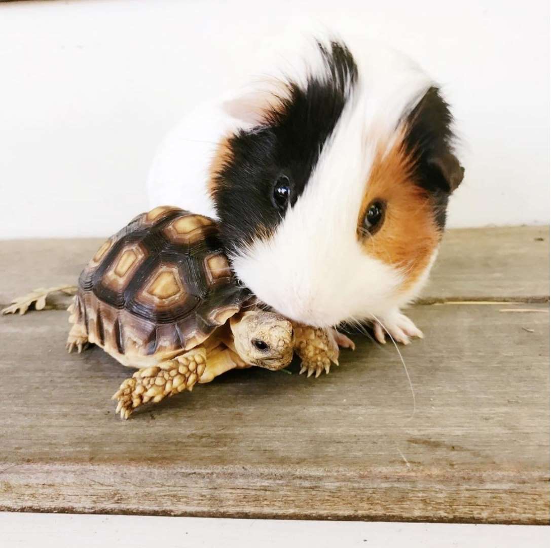 Just because you’re a little hard-headed (or, in this case, shelled) doesn’t mean you can’t find a perfect companion. In this case, Ethel, a Sulcata tortoise, the well-dressed pet of illustrator Kasey Cauliflower, has become BFF with Buster, an adorable guinea pig with whom she enjoys frequent playdates, according to her human caretaker.