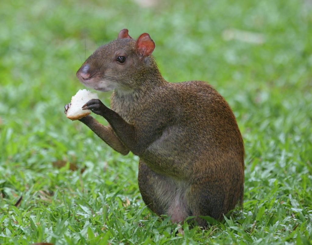 Fallen fruit is the agouti’s favorite food, with nuts a close second. Its sensitive ears can even hear when the fruit hits the ground! The agouti often eats upright, holding its food with the front feet, just like a squirrel.