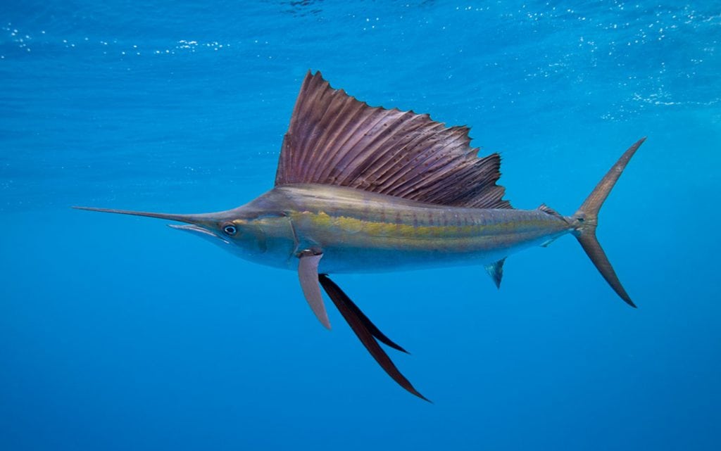 The sailfish’s spear-like bill also comes in handy for slashing at larger prey fish, which stuns them into submission. Together, sailfish engage their huge dorsal fins, creating a fence around their prey to prevent their victims from escaping their clutches.