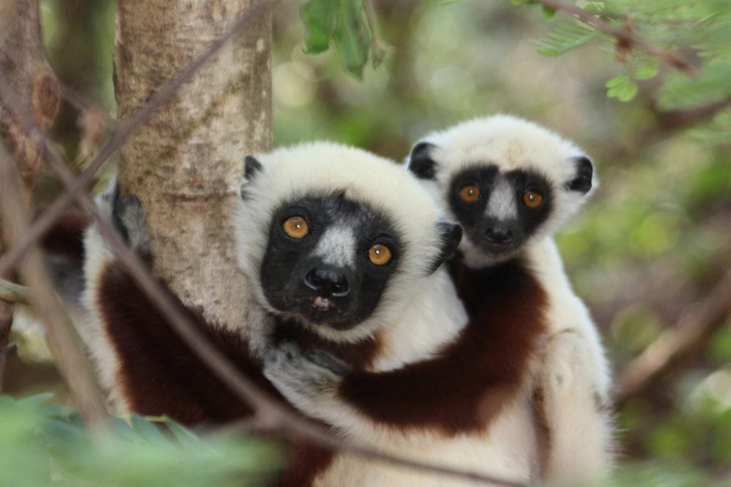 Life in the trees protects sifaka groups from the few predators that share their forest homes. Loud piercing alarm calls warn of danger. All members of a group may simultaneously produce the explosive, nasal, hiss-like call “Shi-fakh, shi-fakh, shi-fakh.” This distinctive call, made by all sifaka species, is what gives the lemur group its name.