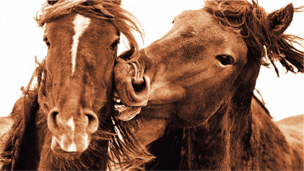 Horses communicate in various ways, including vocalizations such as nickering, squealing or whinnying; touch, through mutual grooming or nuzzling; smell; and body language.