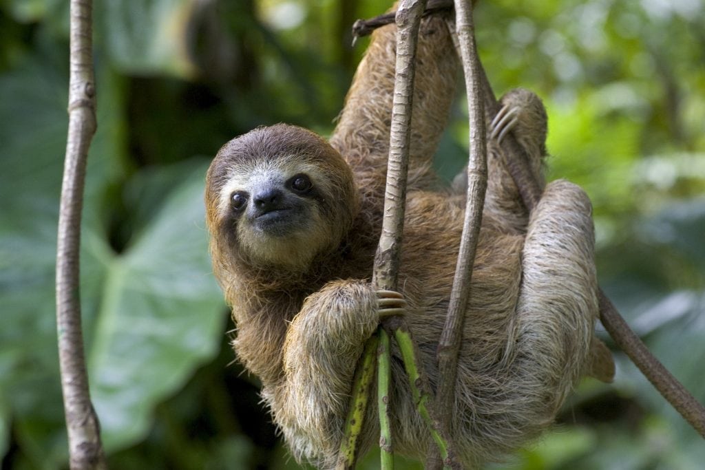 Sloths can barely walk, thanks to their long claws and limbs that are designed to hang from trees; they don’t support their weight on the ground very well. (They have significantly less muscle mass than other mammals.) Instead, they crawl, dragging themselves forward with their forelimbs. That makes them laughably easy targets for predators.