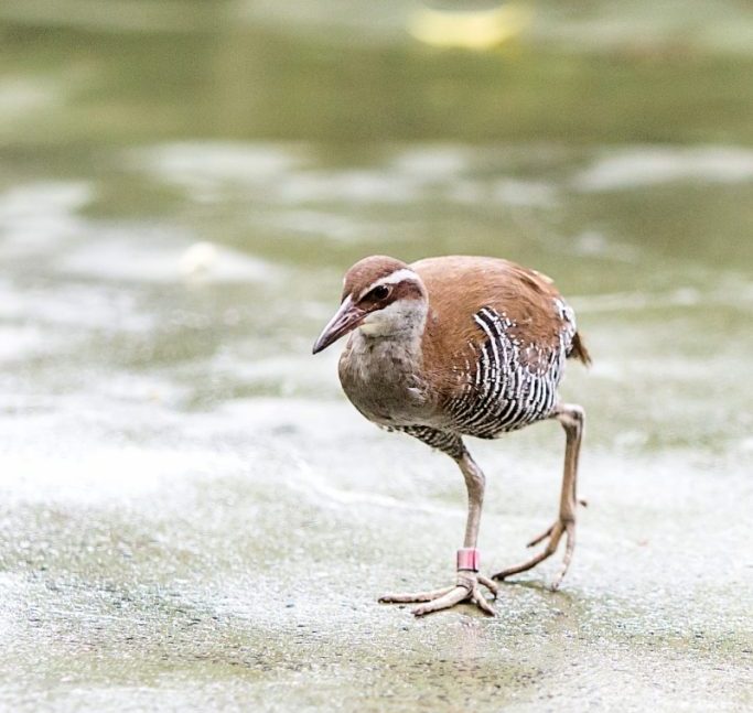 Although Guam rails seldom vocalize, they do respond to other rails, loud noises, or other disturbances with a loud, piercing whistle or series of whistles. During breeding season, the birds make loud, penetrating screeches and short kips.