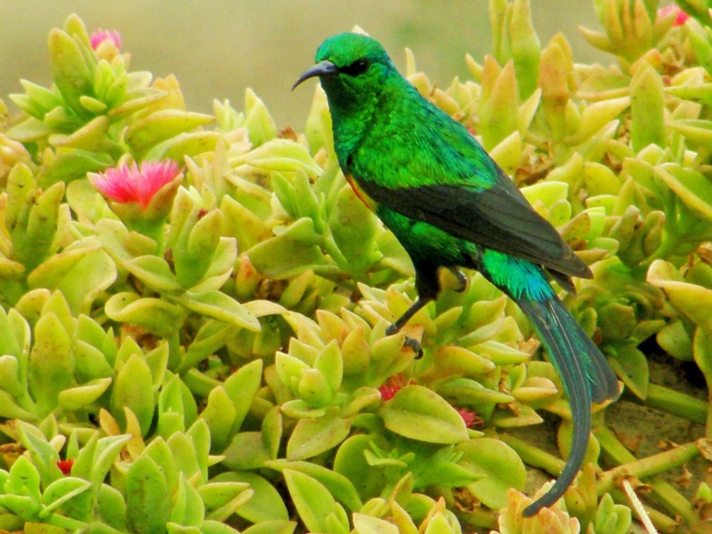 The beautiful sunbird and its fast and fickle feeding style resembles the hummingbird with its small, colorful, compact body, its ability to hoover, and its long, downward-curving bill, but they rarely hang in space to feed and instead perch on branches or suspend from flowers while consuming nectar. Furthermore, the beauties extract nectar by sucking with their tubular tongue, while the hummers lick the nectar from the flower. Their relatives include spiderhunters and flowerpeckers.