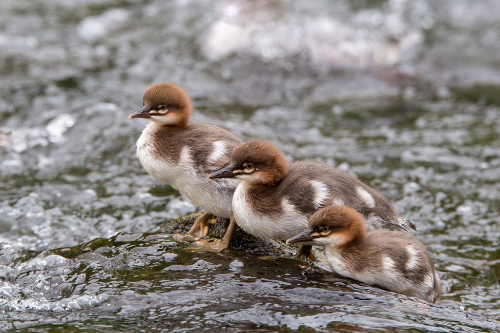 Females, and males when they’re not in their breeding plumage, are usually grey, with a reddish brown head, white chin, and white secondary feathers on their wings. Young goosander offspring will look like adult female goosanders, except they will also show a short black-edged white stripe between the eye and bill.