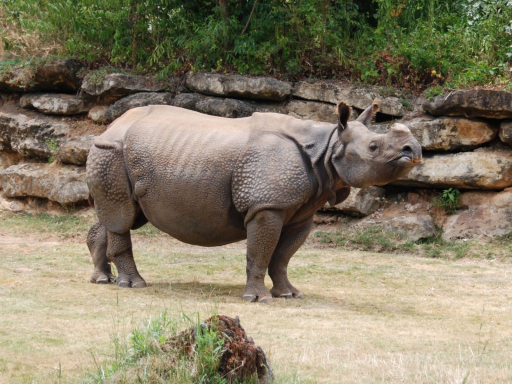 The Indian Rhinoceros is the largest of the three Asian rhinos. The Indian Rhinoceros has a single black horn which is present in both male and female species and a grey hide with pinkish skin folds, which give it an armour-plated appearance. Male Indian rhinos show enormous development of the neck folds.