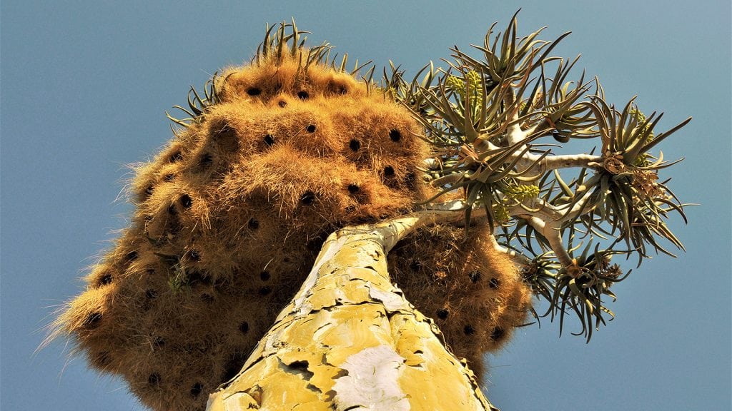 When building the nest, sociable weavers use different materials for different purposes. Large twigs form the roof of the nest and dry grasses create the separate chambers. Sharp spikes of straw protect the entrance tunnels from predators.