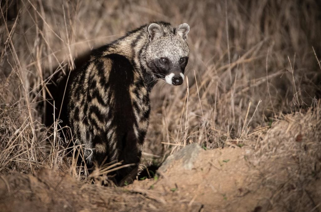 The African Civet is a type of African Viverridae and exist in sub-Saharan Africa. Nocturnal, they spend their nights hunting prey and their days sleeping. What makes them distinct is their coloring. They are black and white striped. They also have a black circles that encompass their eyes giving them the appearance of a raccoon. Find out more!