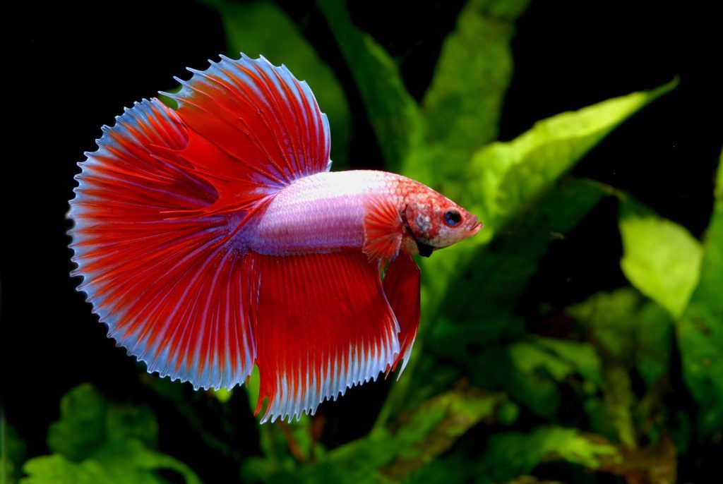 The Siamese Fighter/Betta is a pretty small breed with a pretty complex color scheme despite the modest size. The longish fins are colored in red and the head is covered in a dark color, while the body is covered in a lighter shade. During mating, the male and female spiral and circle around each other making from 10 to 45 eggs each time they “make love” – until all the eggs are released.