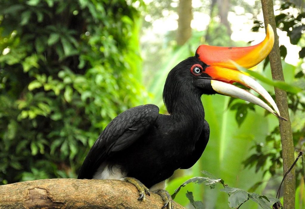 Hornbills have a long tail, broad wings, and white and black, brown, or gray feathers. This contrasts with the brightly colored neck, face, bill, and casque in many species. Females and males often have different colored faces and eyes. Their closest relatives are kingfishers, rollers, and bee-eaters. Find out more!
