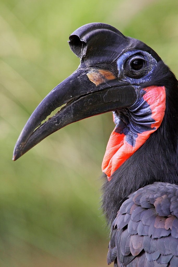 There are two hornbill species that are unique because they are carnivorous and spend most of their time on the ground: Africa’s Abyssinian or northern hornbills and southern ground hornbills. These species patrol their savanna territory on foot in groups of up to a dozen individuals. They eat mice and other rodents, frogs, and even venomous snakes, which they catch by using their long bill as tongs to keep out of harm’s way.