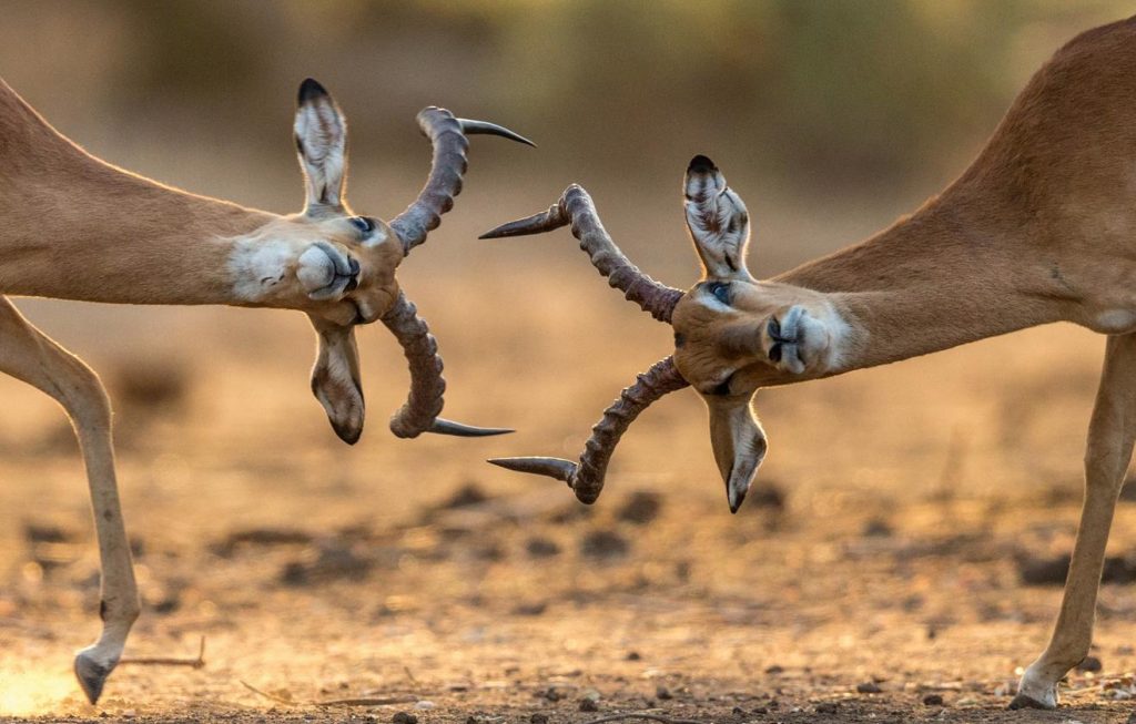 The males are well-known for their curved horns that are able to reach lengths of around 90 cm…that’s bigger than the average impala individual! The male impala are known as rams, mainly due to the fact that the male impala use their horns when defending themselves both from other dominant males and from oncoming predators. The female impala do not have horns at all and they are known as ewes.