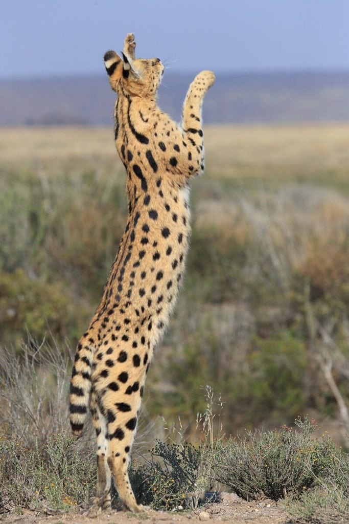 Servals have excellent sense of smell, hearing and sight, which they use both for finding the prey and for avoiding predators. Being a solitary animal, servals only interact with other members of their species when mating, caring for young, or fighting for territory. With a combination of long, powerful legs, deep chest, and slim build allows the serval to reach a sustained speed of 80 km/h (50 mph).
