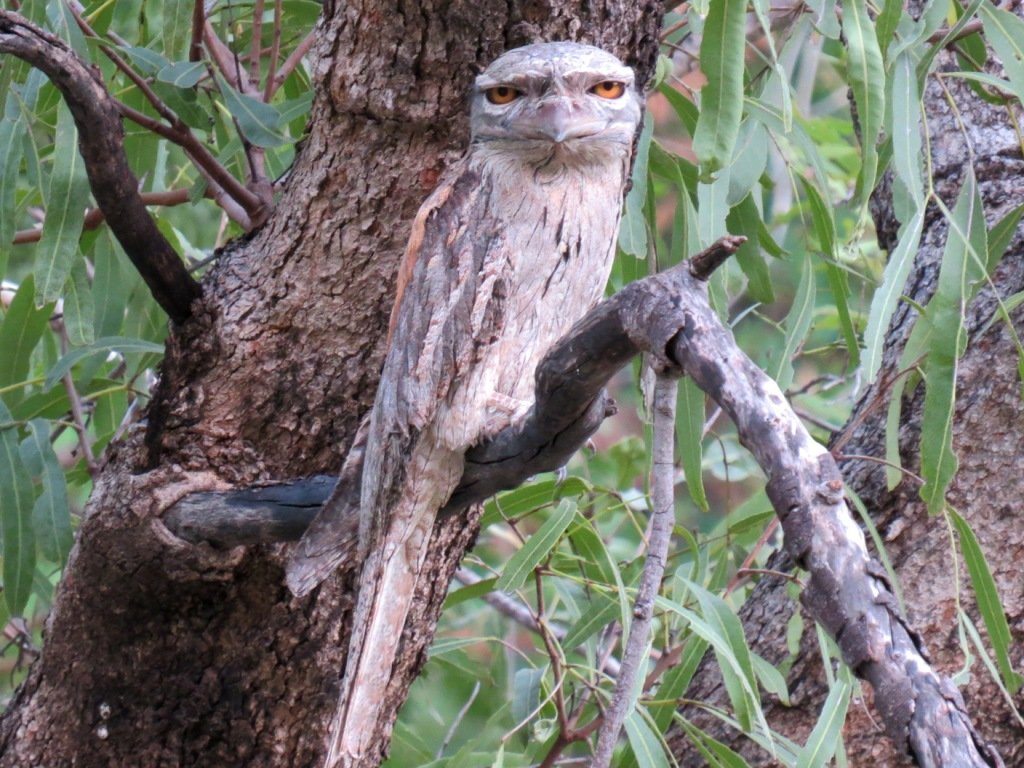 The tail is brown with white spots across it on top while the base of the tail is the same as the body. Some albino frogmouths have been recorded. Their wide bill is coloured olive grey to black. The inside of the mouth is yellow. Their eyes face forward and are large yellow circles resembling those of an owl. Find out more!