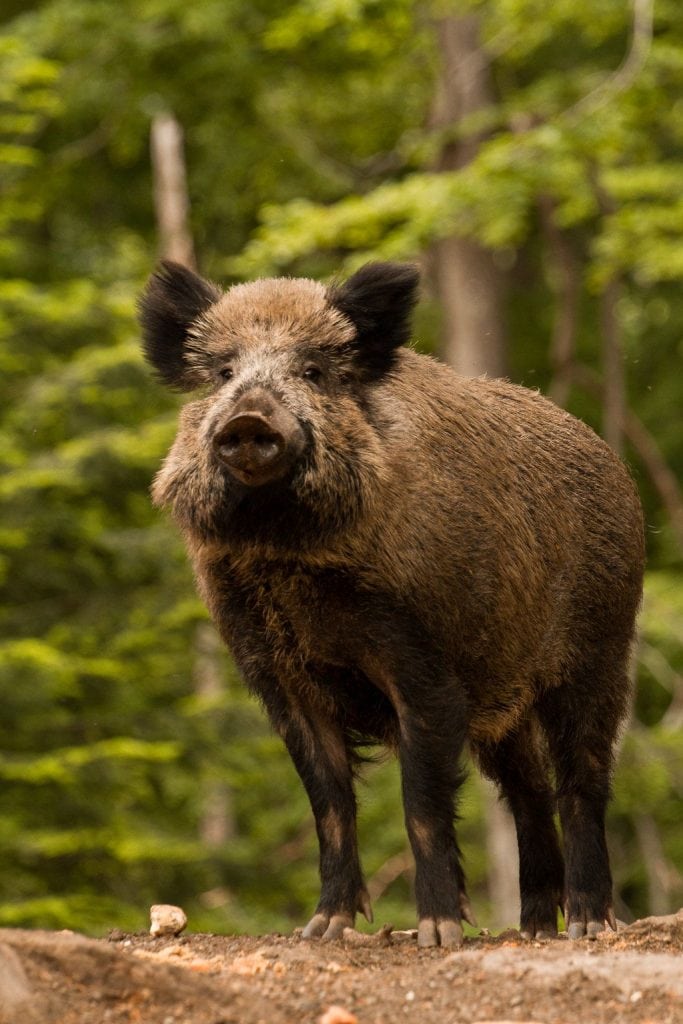 Wild boars are usually nocturnal, foraging from dusk until dawn but with resting periods during both night and day. This is because hunters are most active during the day. Wild boars eat almost anything they come across, including nuts, berries, carrion, roots, tubers, refuse, insects, small reptiles, even young deer and lambs.