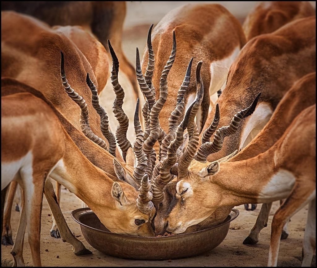 Their digestive systems don’t process fibrous food, such as grass, as well as their cattle relatives. When eating, they use their massive horns to break off branches to reach tasty leaves. Giant eland bulls break branches to provide food for the cows and calves! The horns are also handy for digging up thick-leafed plants, melons, bulbs, roots, and onions.