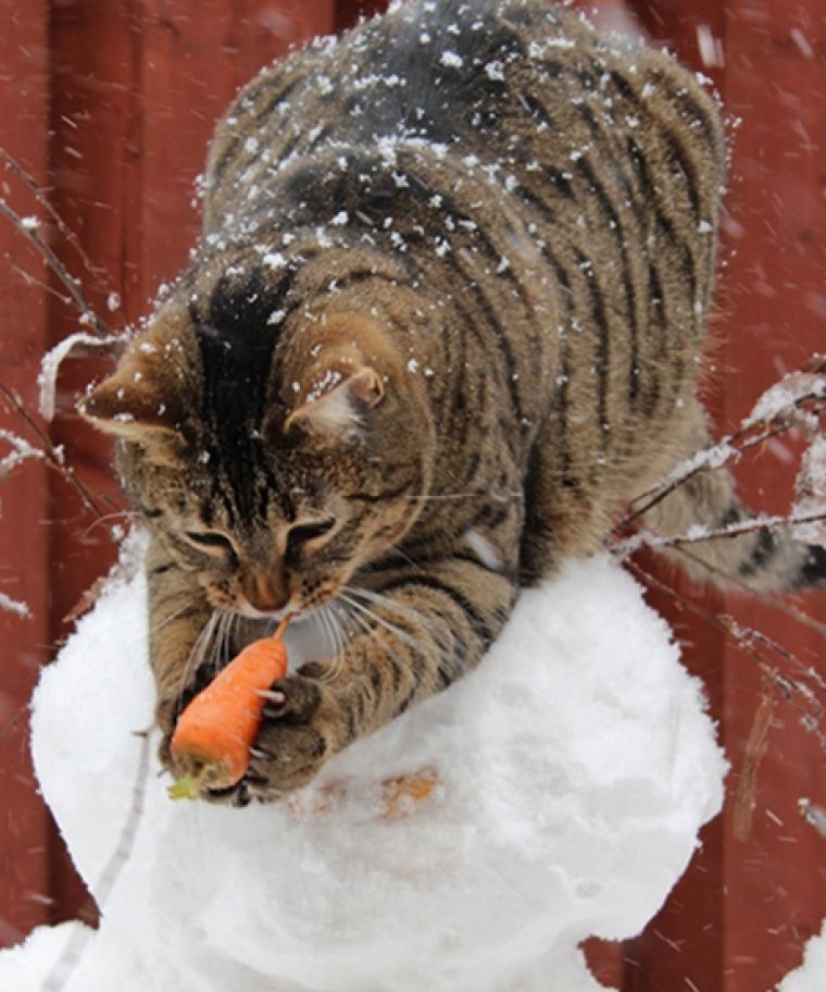 If you didn’t grow up in snowy climate, you might remember how intrigued you were when you saw your first snowfall — and how exciting it was to build your first snowman. For the 12 cats ahead, the whole snowman thing is just CRAZY. They don’t know what to make of it, but it’s pretty hilarious watching them try to figure it out.