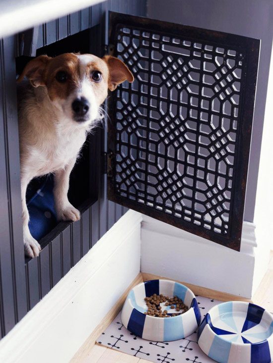 Give Sid a special space with his very own doggie condo. This special den can be built into a lower kitchen cabinet. Use a recycled floor grate as a door that can be closed and latched to keep Sid out – or in.