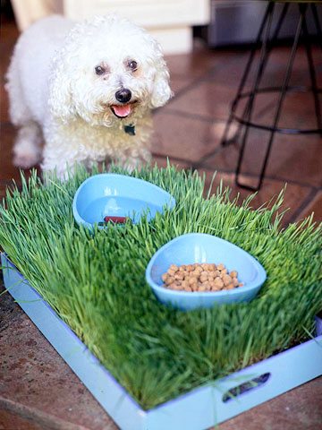 Dinnertime is like a romp in the park for Sweet Pea. Wheatgrass can be grown in trays from kits and is a nutritious snack for dogs and cats.