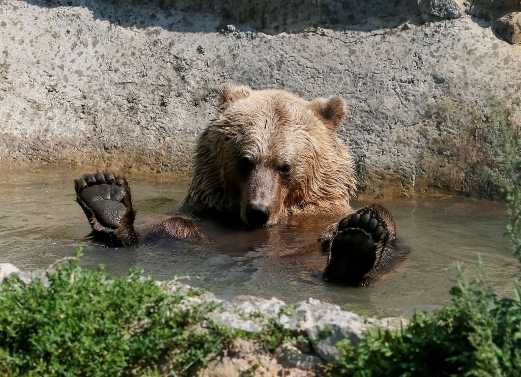 One of the bears rescued from mistreatment bathes at a shelter in Ukraine.