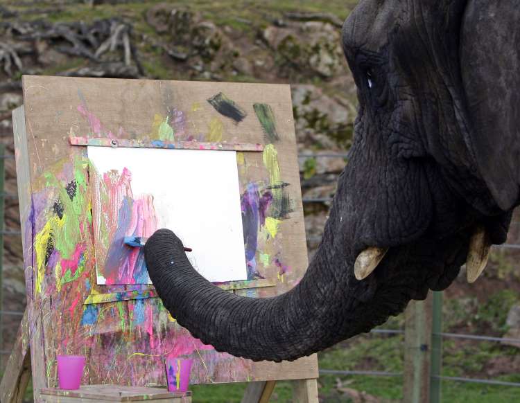 Five, an African elephant, holds a paint brush as it paints a picture of Lottie and Adam Smith (not pictured) at West Midlands Safari Park in Bewdley, central England.