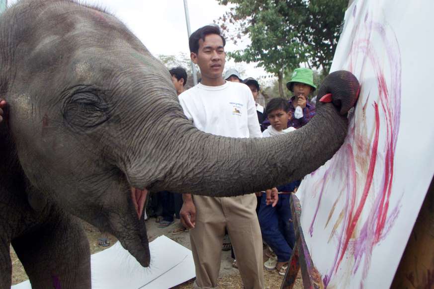 Lucky, a 4-year-old Cambodian elephant, paints for a crowd in Phnom Penh, Cambodia. Lucky was orphaned after poachers shot her parents in the jungle. Sold into slavery, she was later rescued by an animal charity and now performs circus tricks to earn her living.