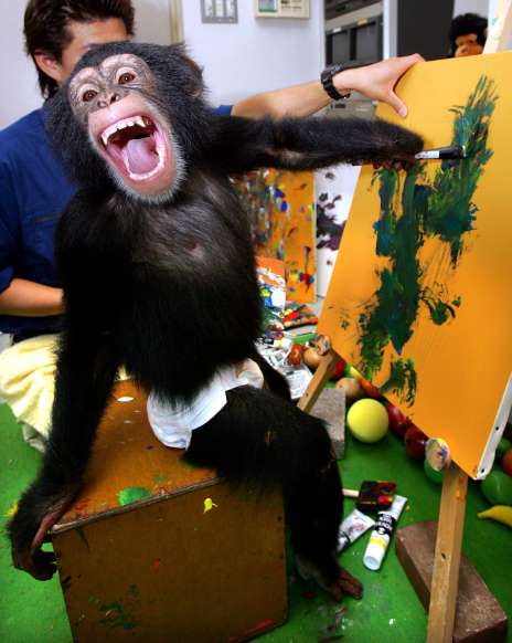 Asuka, a 3-year-old female chimpanzee, reacts to another chimpanzee’s call as she draws an oil painting at a studio at Izu Shaboten Park in Ito, southwest of Tokyo.