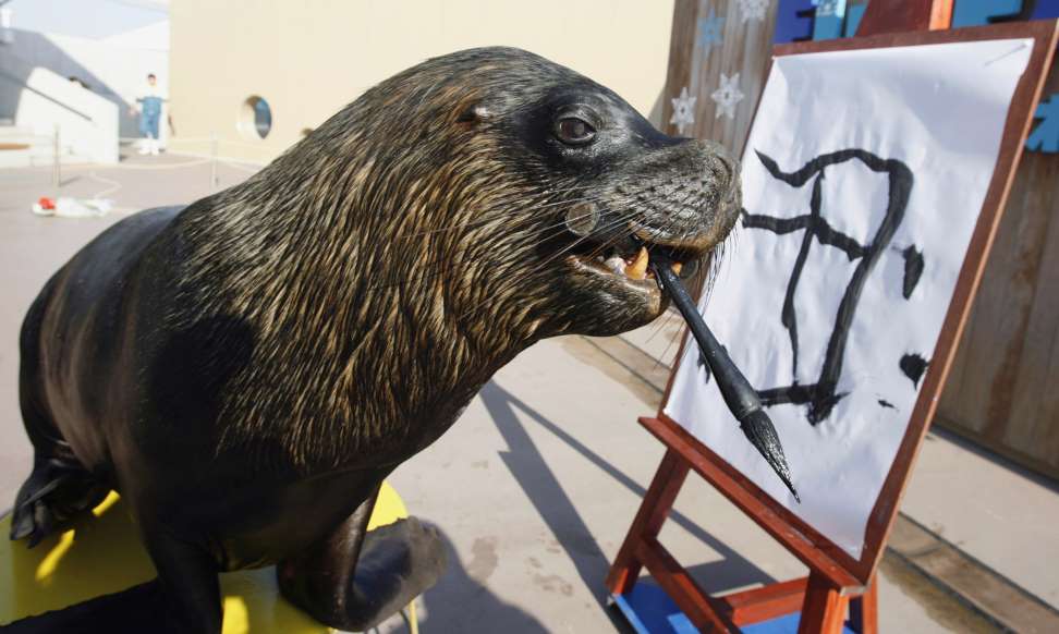 A sea lion named Jackie, biting a calligraphy brush, practices writing the word “ox” in Chinese characters at Hakkeijima Sea Paradise aquarium in Yokohama, southwest of Tokyo, Japan.