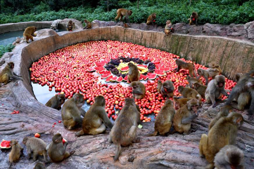 China: Rhesus monkeys cool themselves with iced fruit at Taihangshan Rhesus Monkey National Nature Reserve in Jiyuan