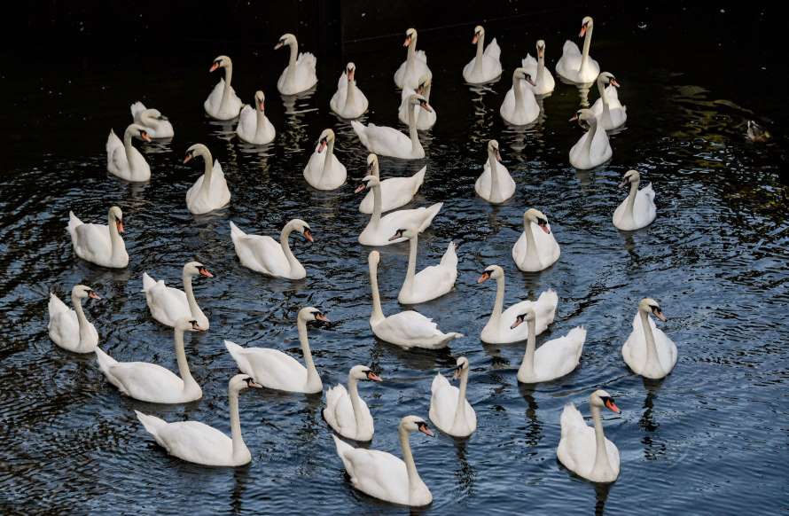 Germany: Alster swans herd together in front of the town hall in Hamburg