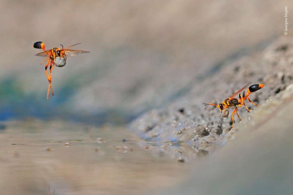 The waterhole in Australia’s Walyormouring Nature Reserve is literally buzzing in the summer. Mud daubers roll mud into balls to build their nests, and this shot of female wasps gathering their building materials won the Behaviour: Invertebrates category from NHM.
